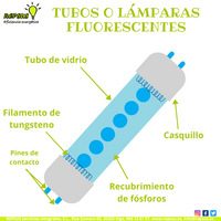 La tecnología en la que basa la iluminación fluorescente consiste en el uso de una lámpara de vapor de mercurio a baja presión para producir luz eléctrica. Estas lámparas están compuestas por un tubo fino de vidrio cuyo interior se encuentra revestido por fósforos, compuestos químicos que emiten luz visible cuando están expuestos a una radiación ultravioleta, y que contienen también en su interior vapor de mercurio y gases inertes, comúnmente argón y neón, a una presión inferior que la atmosférica.
