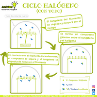 El ciclo halógeno consiste en que el tungsteno, también conocido como wolframio, una vez evaporado se une al gas halógeno (yodo o bromo) y forma un compuesto gaseoso, ya sea diyoduro de wolframio o hexabromuro de wolframio. Este gas se mueve caóticamente dentro del tubo hasta que, al entrar en contacto con el filamento, éste, al estar incandescente, provoca la separación del compuesto. Así, el tungsteno se deposita de nuevo en el filamento, y el gas halógeno vuelve a su estado inicial.