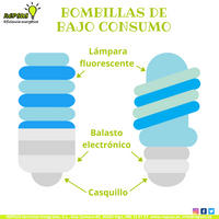 Por otro lado, las bombillas de bajo consumo, también conocidas como lámparas fluorescentes compactas, lámparas fluocompactas o LFCs, consiste en la lámpara fluorescente doblada de formas distintas dependiendo del formato para alcanzar un tamaño similar al de una bombilla tradicional sin disminuir su superficie, un balasto electrónico en su base, y en la base de éste, un casquillo metálico y, en ocasiones, pines de contacto.